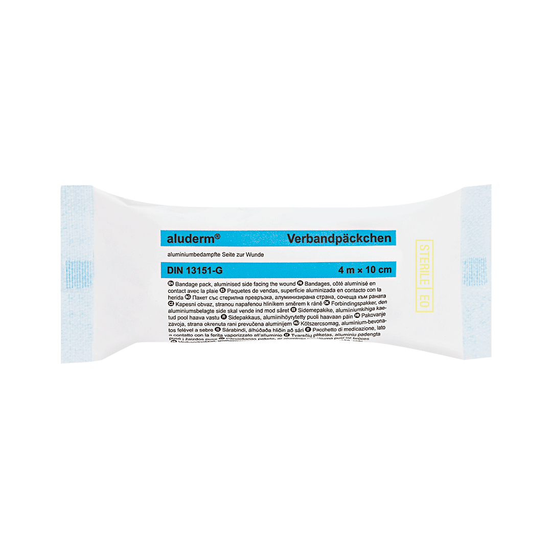 Aluminiumsbelagt aluderm®-kompress med et sterkt absorberende lag, forseglet på en elastisk WS-fikseringsbandasje; kveler ikke.