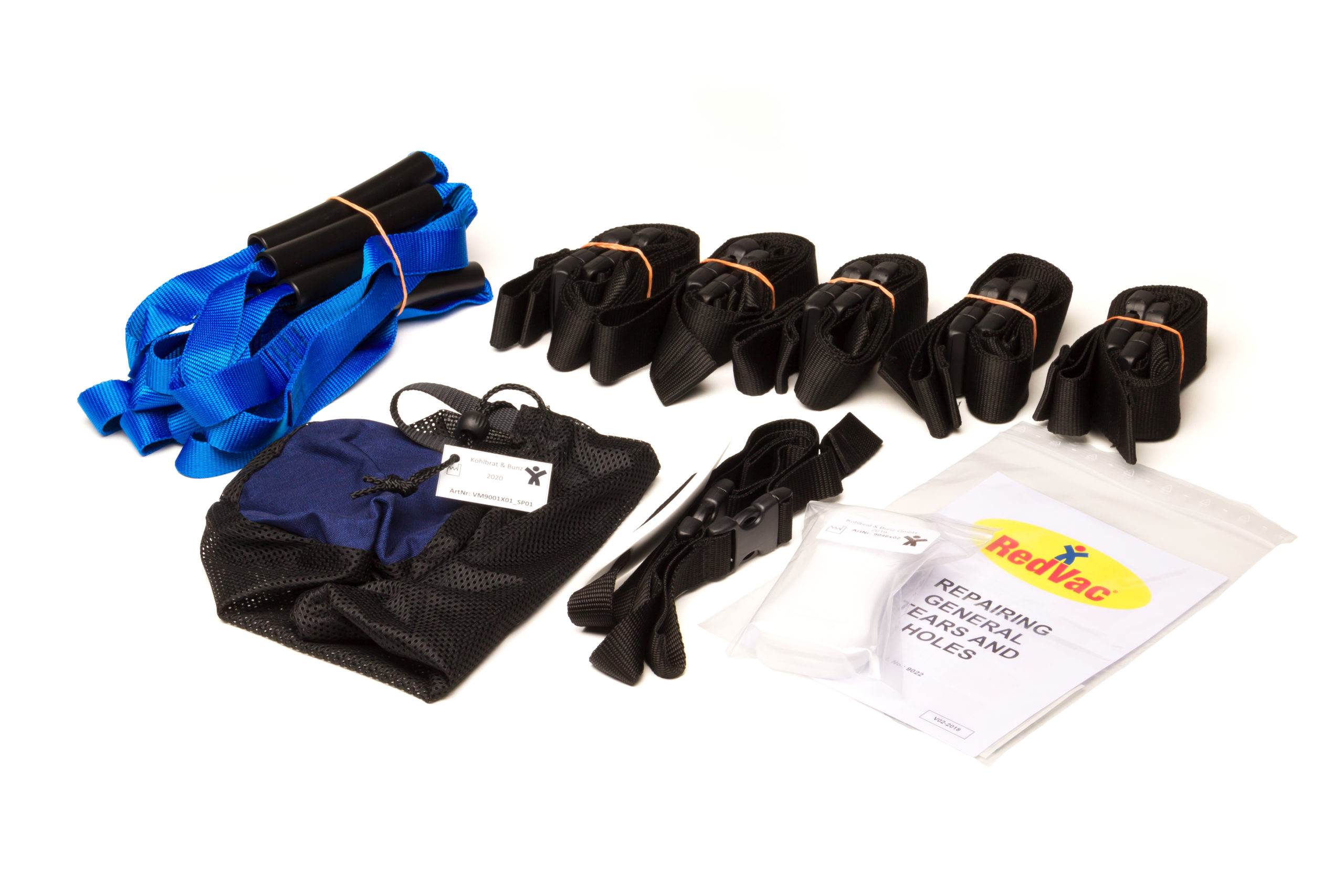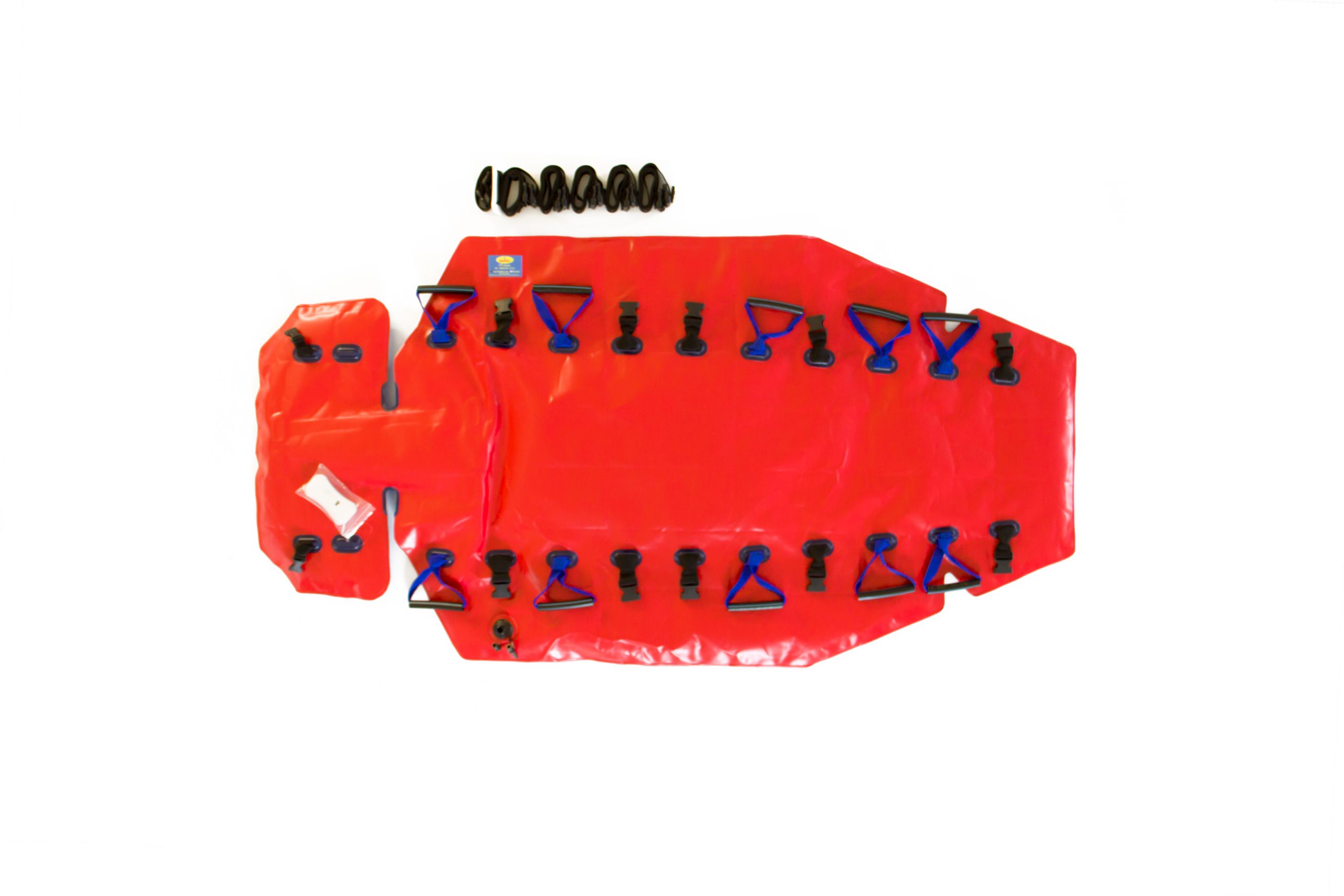 Beltesett til Luftambulanse Vakuummadrass. Settet innholder belter, håndtak, kit og pad for hodestabilisering.