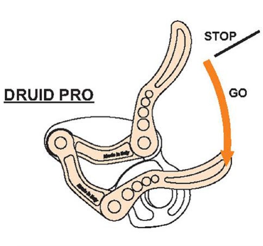 Druid Pro kan ikke åpnes og kobles fra tauet uten å ta den av karabineren. På grunn av dette er det laget et festepunkt for sikring av bremsen mot fall. Dette gjør at bremsen egner seg svært godt for arbeid på steder lange rapeller og uten mange taubytter.