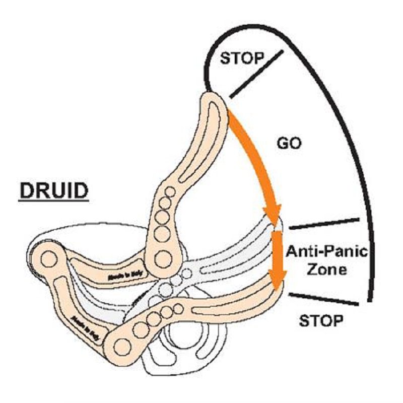 Druid kan ikke åpnes og kobles fra tauet uten å ta den av karabinen. På grunn av dette er det laget et festepunkt for sikring av bremsen mot fall. Dette gjør at bremsen egner seg svært godt for arbeid på steder lange rapeller og uten mange taubytter.