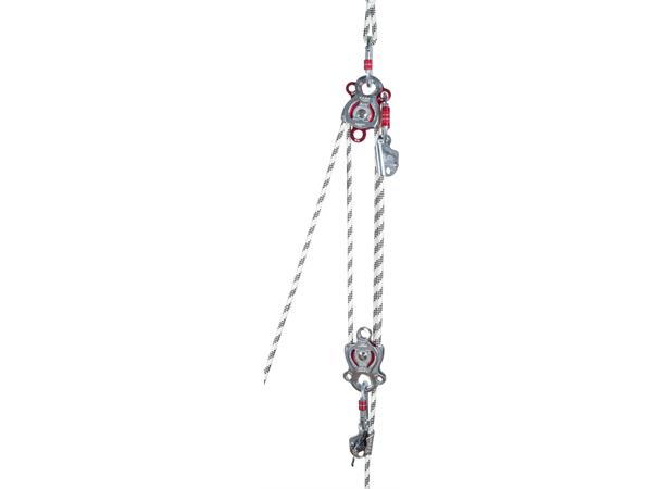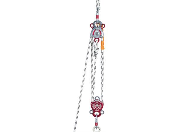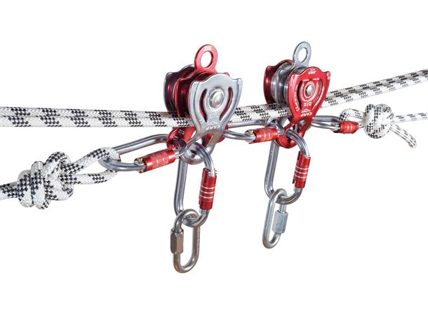 Det er plass til tre karabiner i topphullet og én karabiner i bunn. For å gi et hav av muligheter er det lagt til et riggepunkt på hver side av trinsen, dette kommer veldig godt med dersom du skal trekke sideveis eller lage avanserte redningssystem.