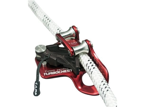 Camp Turbochest brystklemme er den raskeste og mest effektive brystklemma som finnes. Unødvendig friksjon er det samme som motstand, og på oppstigning er det i de fleste tilfeller greit å ikke ha mer motstand enn nødvendig. Her er det to trinsehjul som sørger for at tauet glir lett gjennom klemma. Det gjør at du trenger mindre vekt i bunn av tauet, ikke trenger å kåle med å stramme inn tau, men kan fokusere 100% på bevegelsen oppover.