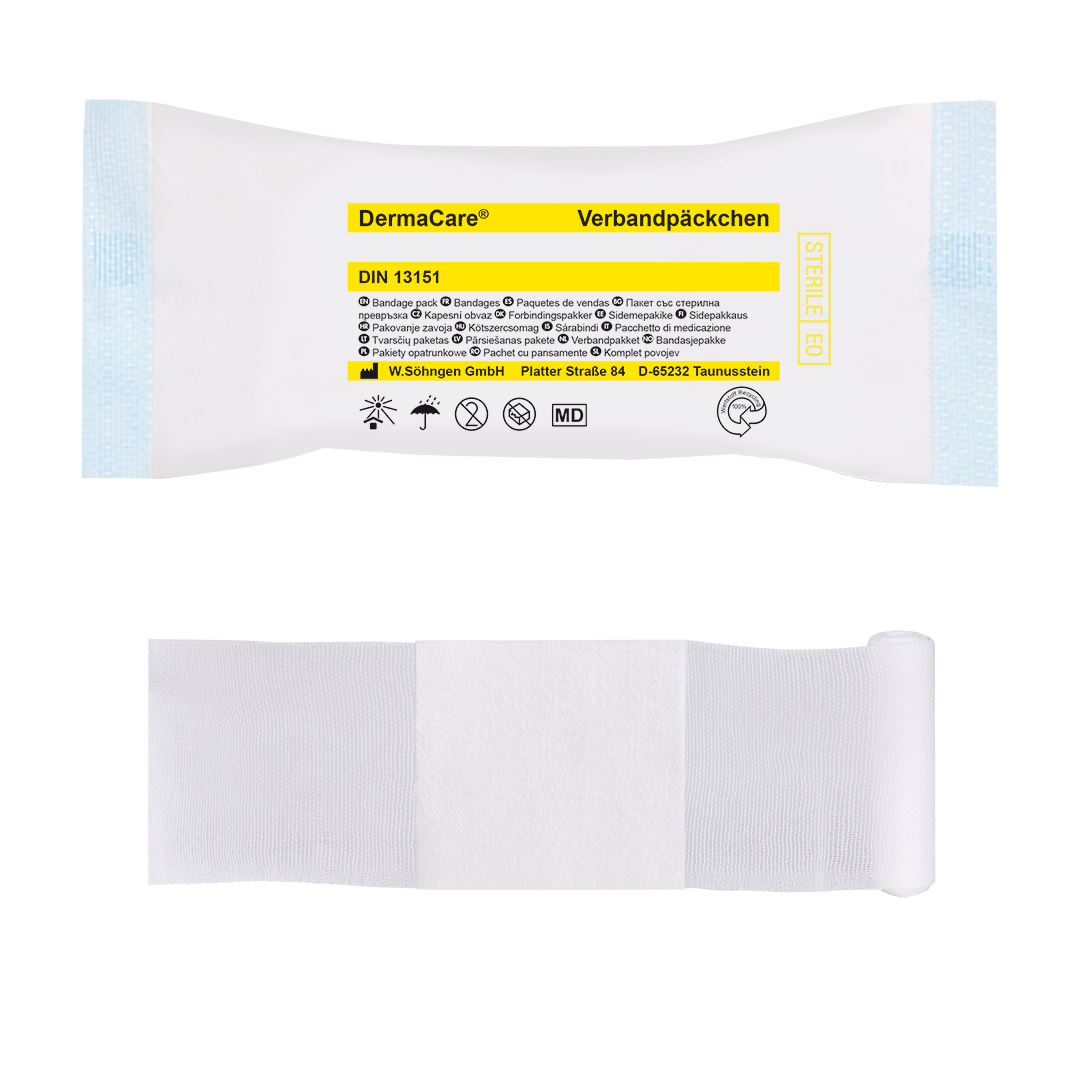 DermaCare®-kompress, forseglet på en elastisk WS-festebandasje, kveler ikke. SÖHNGEN® no-touch wrap, individuelt steril i skrellepakning.