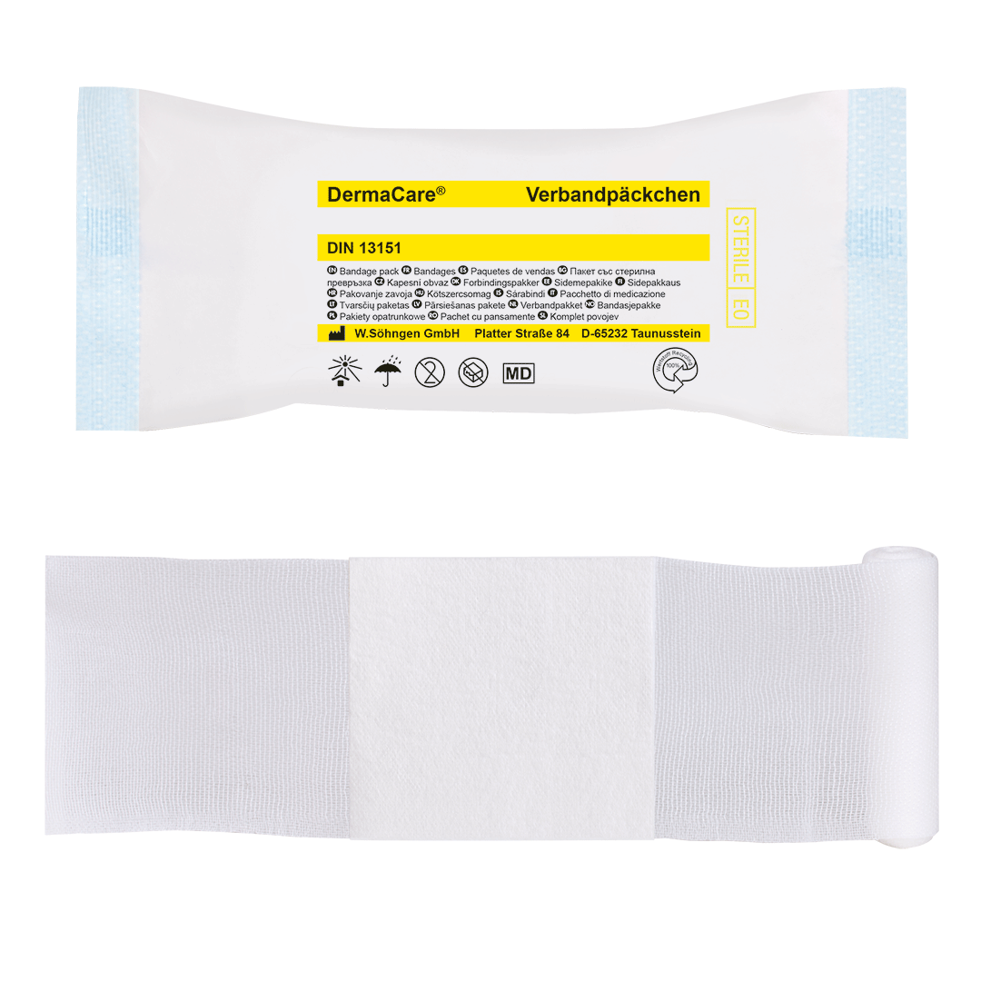 DermaCare®-kompress, forseglet på en elastisk WS-festebandasje, kveler ikke. SÖHNGEN® no-touch wrap, individuelt steril i skrellepakning. DIN 13151.