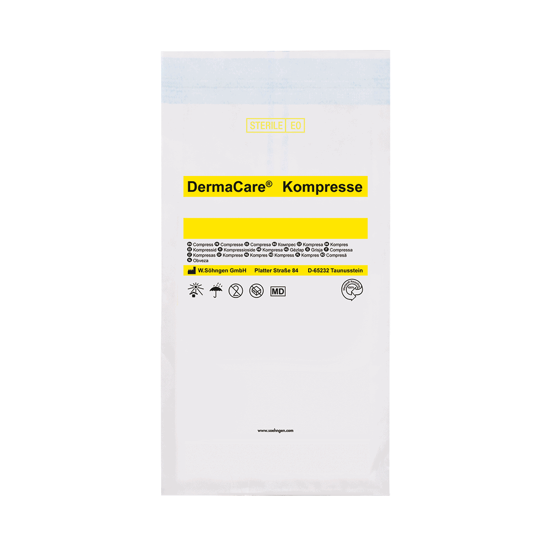 DermaCare® – den vakre sårpleien. Viskosefleece, spesielt myk og kosete, ekstremt høy absorpsjonsevne på 2000 g/m². Hydrofil PP non-stick fleece på begge sider, absolutt glatt overflate, fester seg ikke til såret. Hudvennlig, pustende, pasientvennlig, ingen irritasjon, ingen overfølsomme reaksjoner. Fysiologisk ufarlig, uten kjemiske bindemidler og optiske blekemidler. EO sterilisert, i skrellepakning, fargekode gul.