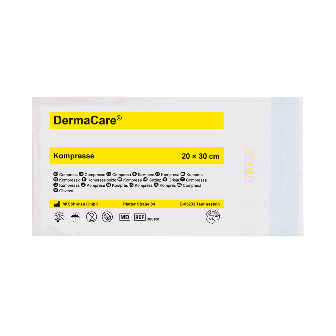DermaCare® – den vakre sårpleien. Viskosefleece, spesielt myk og kosete, ekstremt høy absorpsjonsevne på 2000 g/m². Hydrofil PP non-stick fleece på begge sider, absolutt glatt overflate, fester seg ikke til såret. Hudvennlig, pustende, pasientvennlig, ingen irritasjon, ingen overfølsomme reaksjoner. Fysiologisk ufarlig, uten kjemiske bindemidler og optiske blekemidler. EO sterilisert, i skrellepakning, fargekode gul.