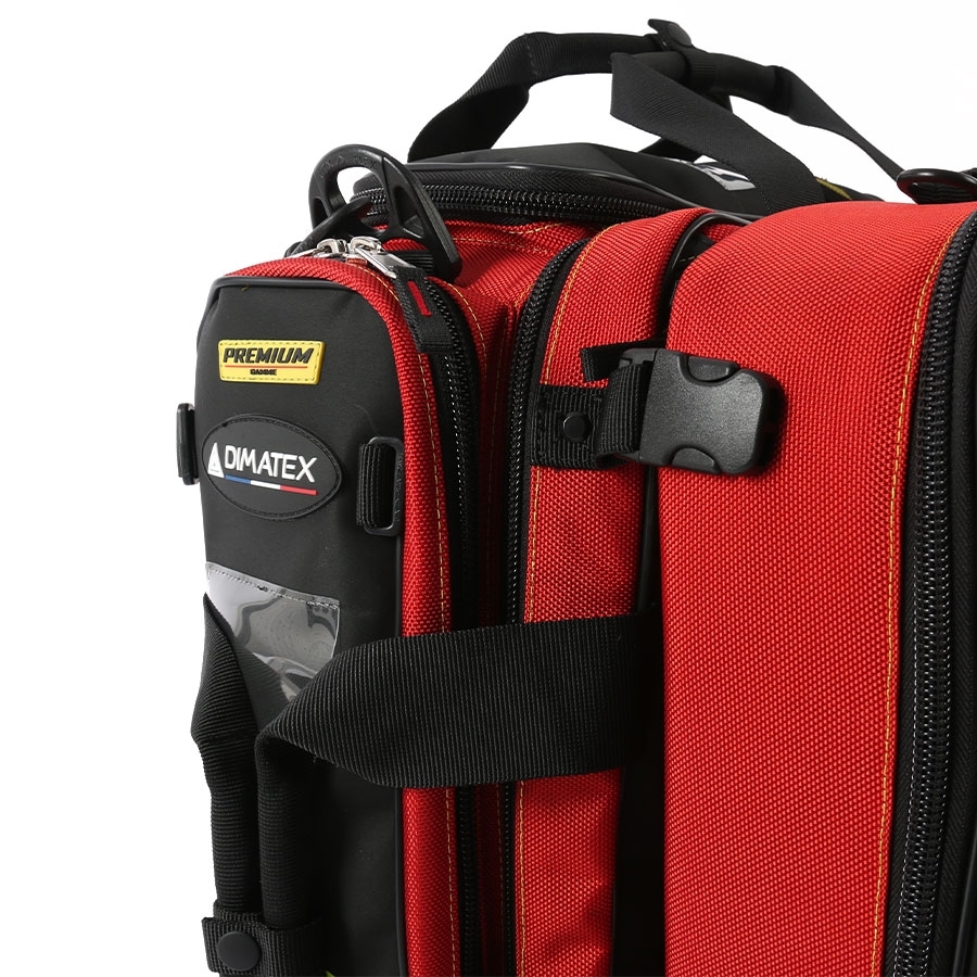 Dimatex Intrepid førstehjelpssekk har naturligvis ryggstropper, og også bærehåndtak og skulderstroppe for lettere manøvrering av sekken. Avtagbare stropper. Den har gul eller hvit refleks og muligheter for personlig merking.