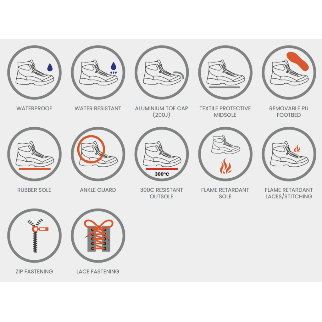 Pyros brannstøvel (20 cm) er høyytende allsidige brann- og redningsstøvler med lynlås foran, tykt fullnarvet flammehemmende lær og verdensledende teknologi GORE-TEX®-stoff for eksepsjonell pusteevne for å holde føttene varme og tørre. Pyros er designet med en beskyttende aluminiumståhette og tekstilbeskyttende mellomsåle, og har et høyvegget DDR-sålesystem injisert på overdelen for optimal feste.