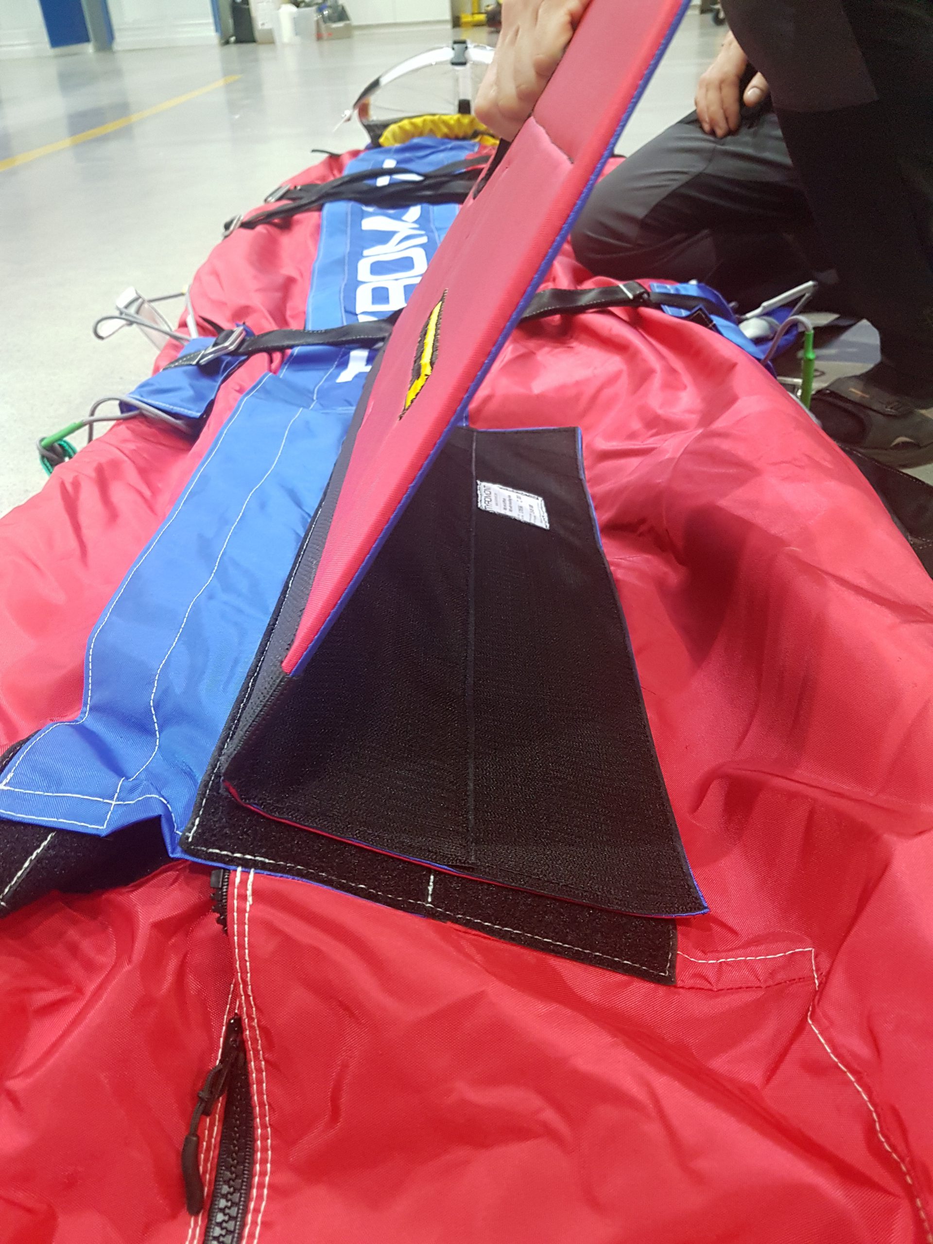 Rotasjonsbremsesystemet er festet til Rescuebaggen med borrelås og et sikkerhetsbelte .