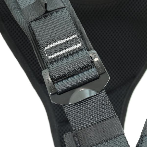 Den er også praktisk for arbeidere som kler på selen flere ganger i løpet av dagen eller har på store klær. Selen kan åpnes via den ventrale triact lock karabinen og de to Cobra® automatiske spennene på benløkkene.