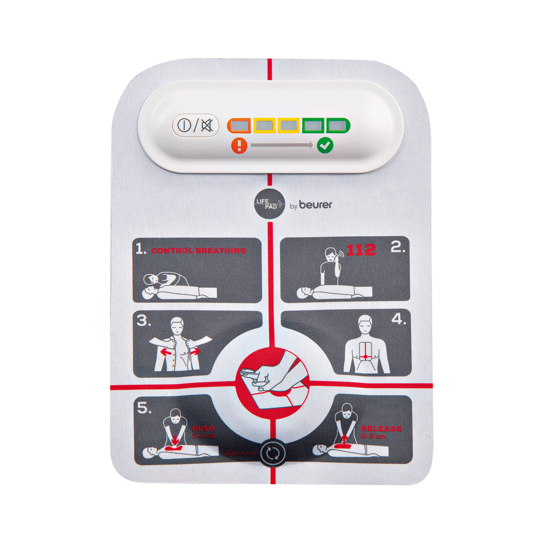 Støtteflaten viser den nøyaktige plasseringen av hendene for gjenopplivning. LifePad® kan også brukes i kombinasjon med en defibrillator (signaltonen kan slås av).