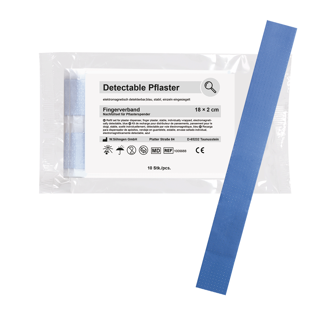 Matgodkjent detekterbare plaster passer til alle aktivitetsområder der mat håndteres. Raskt visuelt gjenkjennelig takket være den blå fargen, enkel og pålitelig å finne med konvensjonelle metalldetektorer takket være den integrerte metallstripen. Plastrene er hypoallergene og pustende, akrylatlimet er spesielt hudvennlig og fester seg pålitelig.