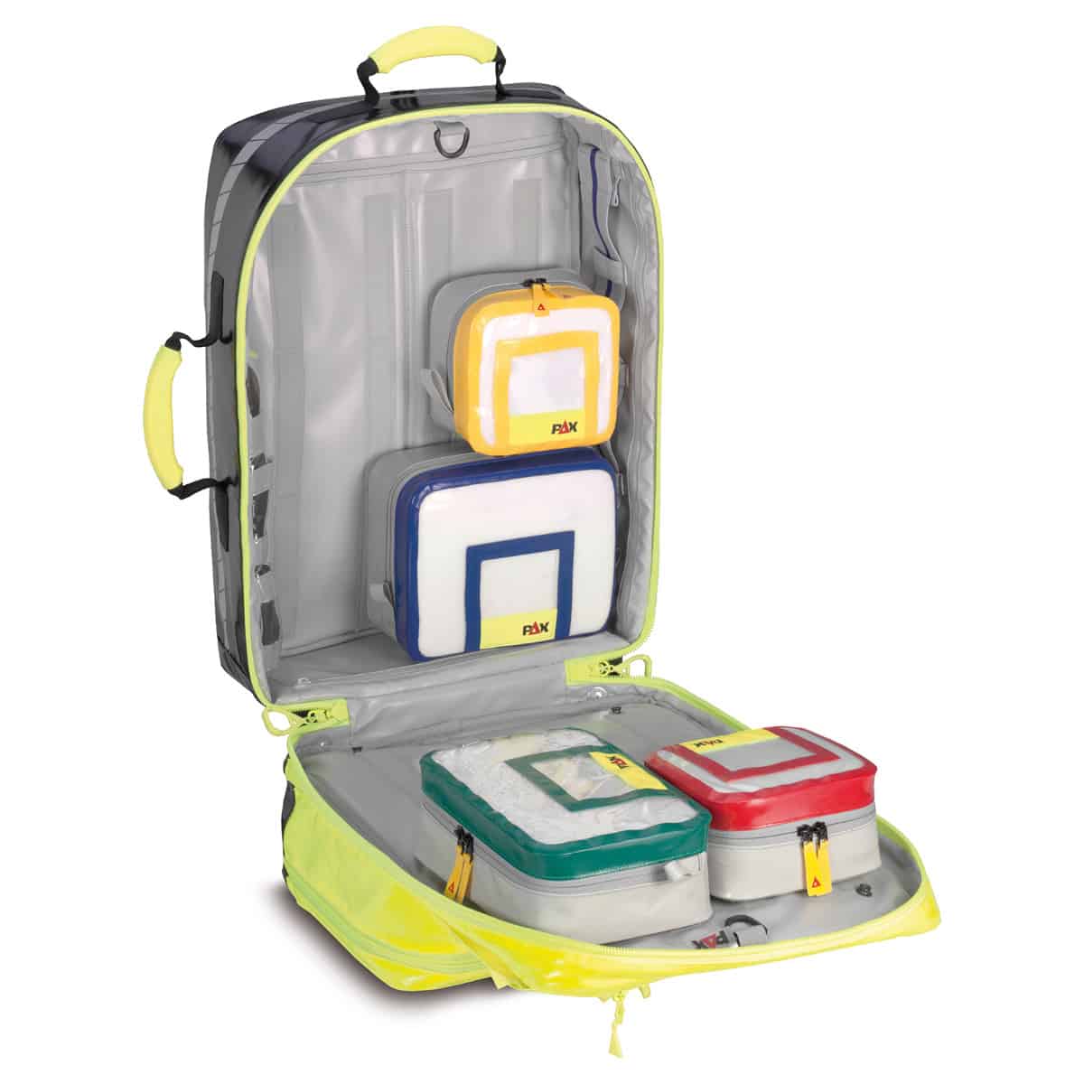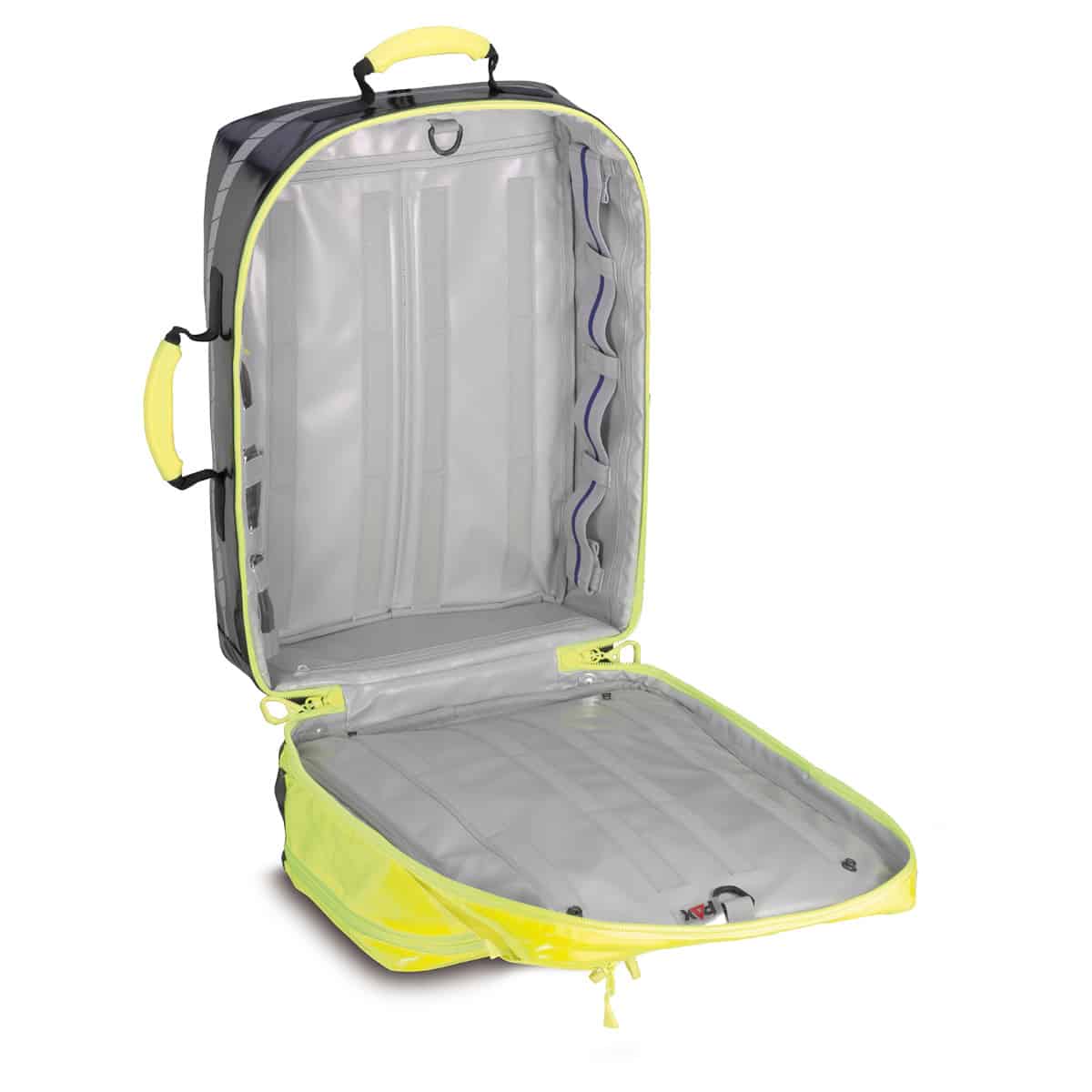 Kroppen til denne ryggsekken viser sitt sanne organisatoriske talent. Her kan du ordne våre valgfrie PAX-innerlommer fritt og enkelt. Borrelåsbåndene sydd på innsiden av ryggen holder dem sikkert på plass. Rundt hele kroppsrammen har vi festet brede gummibåndløkker. Med disse kan du for eksempel oppbevare masker. Om nødvendig kan du fjerne gummibåndløkkene eller erstatte dem. I tillegg har vi festet flate klare poser i rammen slik at du for eksempel har undersøkelseshansker klar. Alle PAX Wasserkuppe gummibåndløkker er merket enten rødt for sirkulasjonssikkerhetsmateriell eller blått for luftveissikkerhetsmateriell. I kombinasjon med innerlommene, som også er merket i farger, hjelper dette med å implementere optimal organisering i ryggsekken.