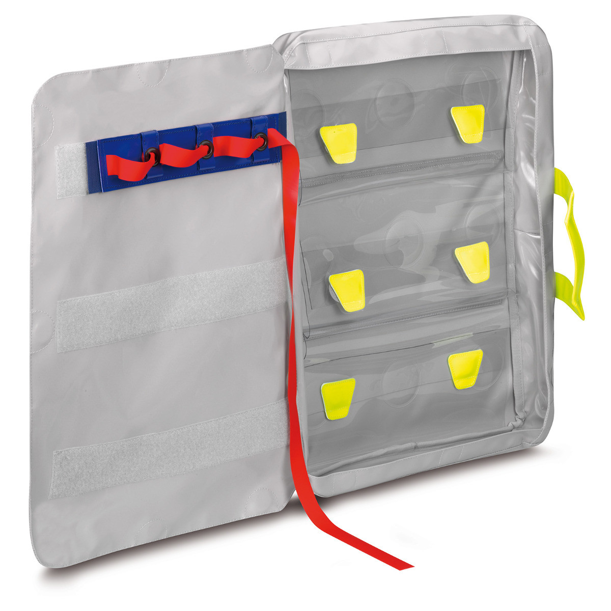 Toppskillevegg: Gummiløkker med rød fargekoding for sprøyter eller inneliggende katetre. Bunnskille: gjennomsiktige lommer for dressingmateriale, tilgangsmateriale etc.