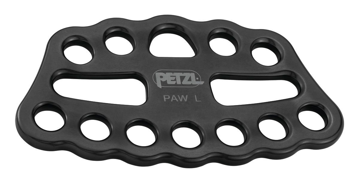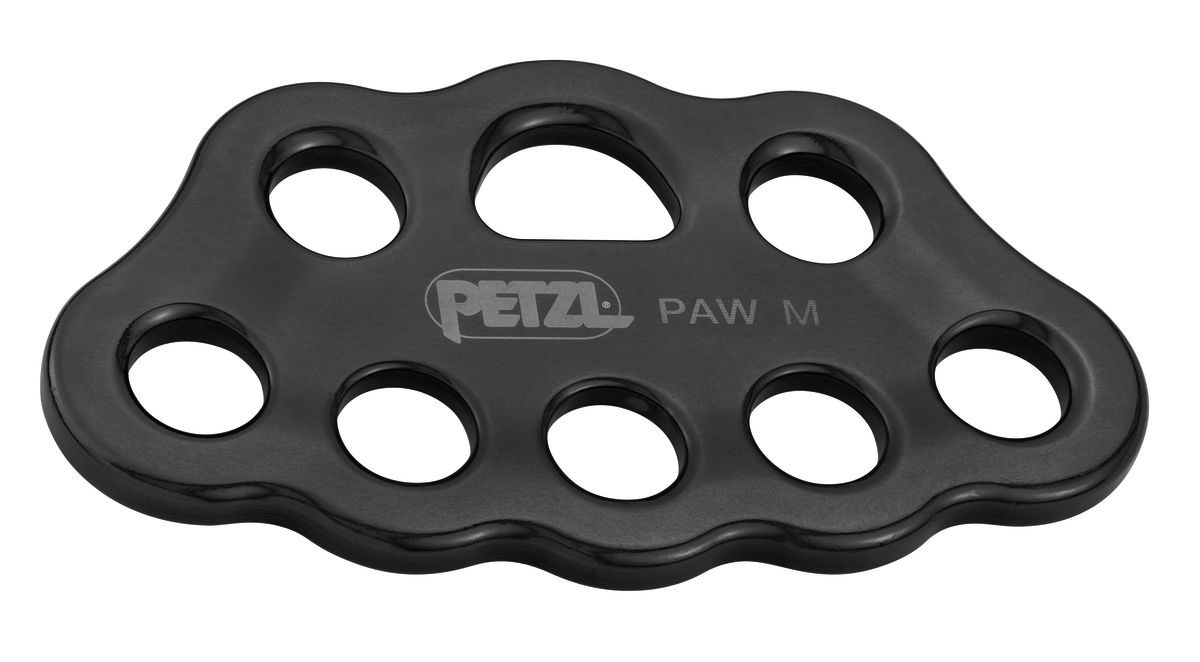 Petzl Paw riggeplate svart er laget for organisering av arbeidsstedet og rigging av flere forankringspunkt. Riggeplate er et meget godt hjelpemiddel med mange bruksområder; alt fra et ryddig standplass til et ryddig båreoppsett. Hullene er på 19 mm, så man kan lett snu karabinen uten å ta den av platen.