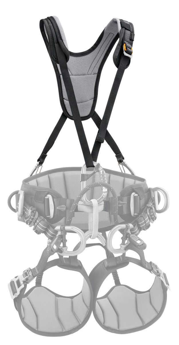 Petzl Sequoia SRT strap skulderstropper gjør at vekten også fordeles til skuldrene når hoftebeltet belastes. Kobles til sentralløkken på selen og til de to punktene bak på hoftebeltet. DoubleBack selvlåsende spenner for rask og enkel justering.