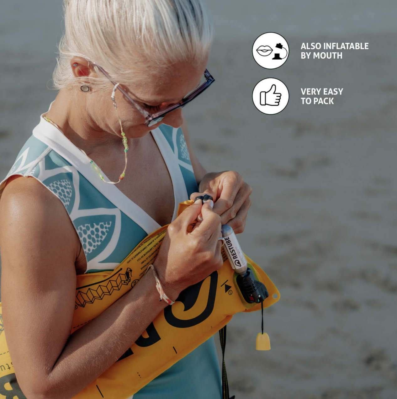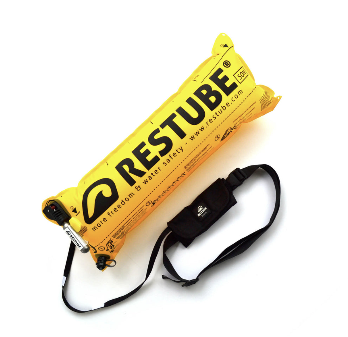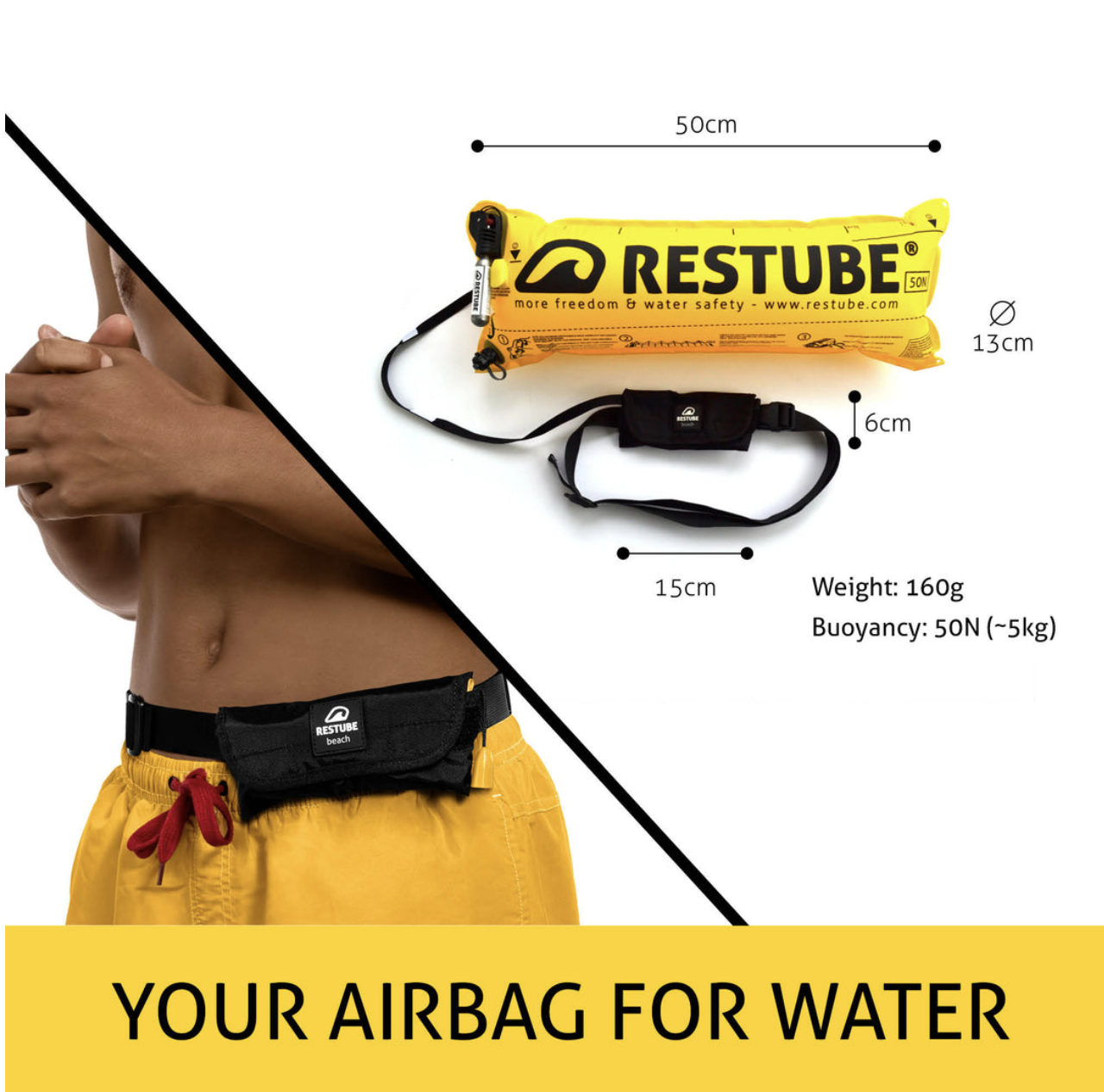 Restube Beach flytetube for turen på ut stranden eller til vannet. Ypperlig å ha når man er ute og bader, svømmer rundt eller snorkler. Blir du veldig sliten eller tatt av strømmen, trekk i snora og flytetuben blåser seg opp slik at du kan flyte på den å holde hodet over vann, eller vifte med den for å fange oppmerksomheten. Den synlige flytetuben blåses opp i løpet av sekunder og er lett å svømme med.