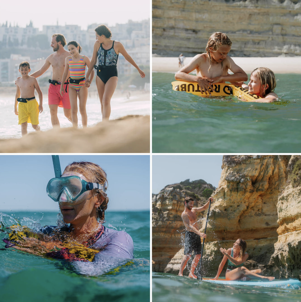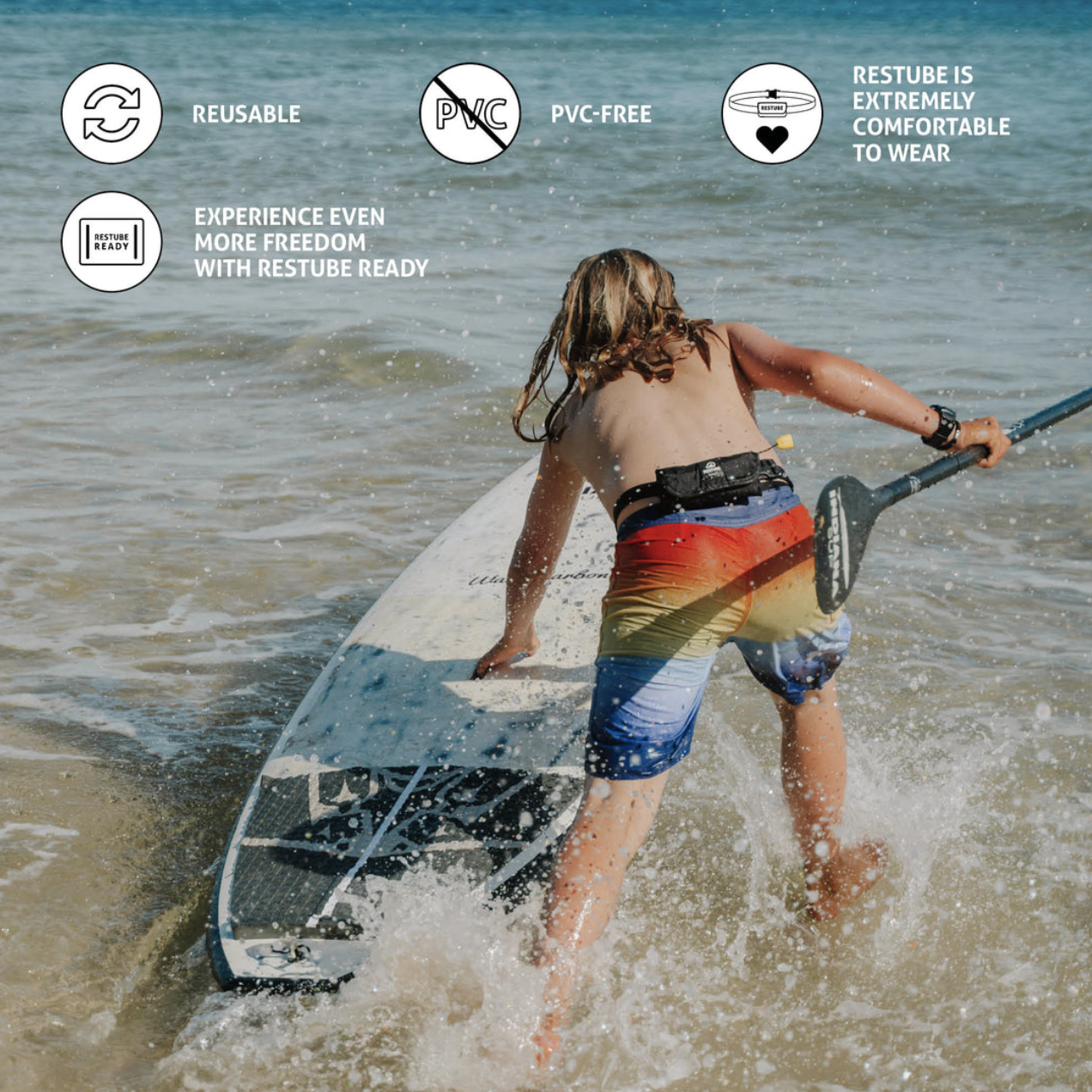 Restube Beach gir nok oppdrift (50N) for voksne og barn fra 10 år og oppover, i badetøy, og oppbevares kompakt på beltet utav veien for morroa. Flytetuben kan også trekkes opp for å hjelpe andre i vannet. Kanskje ser du et barn som sliter eller har en venn som blir veldig sliten.
