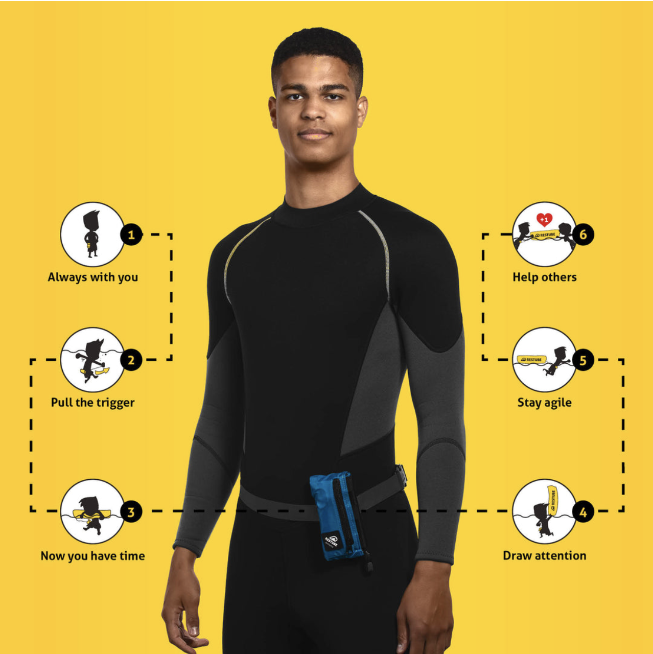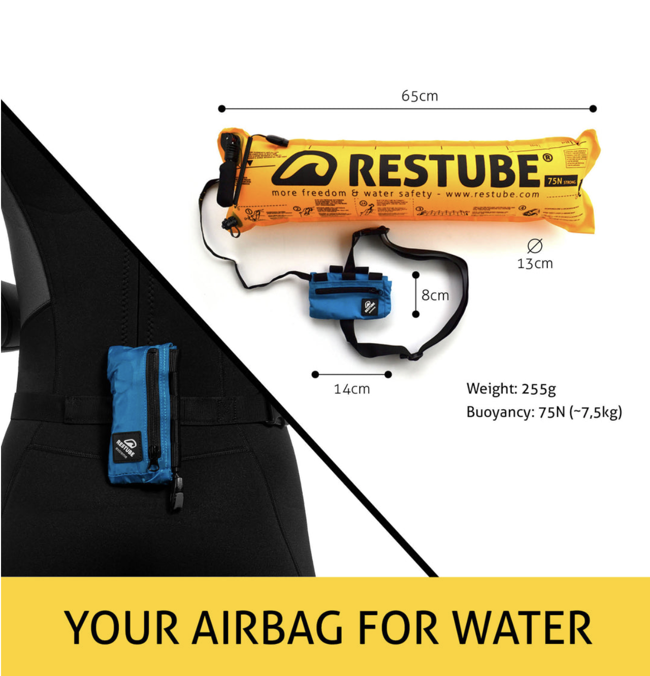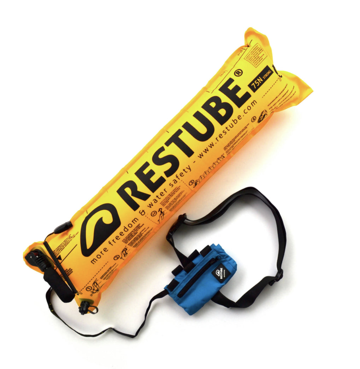 Den gule, synlige Restube-bøyen blåses opp i løpet av sekunder og gir nok oppdrift (75N) for voksne. Len deg over den for å holde hodet opp av vannet, eller vink med bøyen for å fange oppmerksomheten, alternativt dra den bak deg. Du kan også dykke gjennom bølger og dele oppdriften med andre, noe som gjør den til den ideelle følgesvennen i åpent vann.
