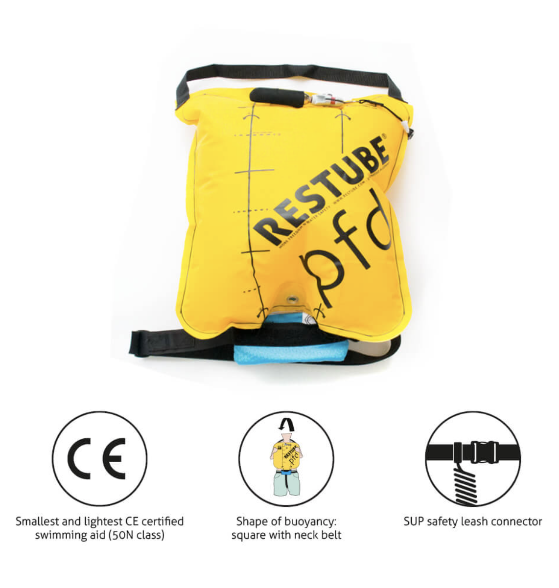 Restube PFD flytevest er den minste og letteste flytehjelpen på markedet, og er i tillegg gjenbrukbar. Flytevesten har firkant flytepanel med nakkebelte, og med SUP kobling for sikkerhetsbånd.