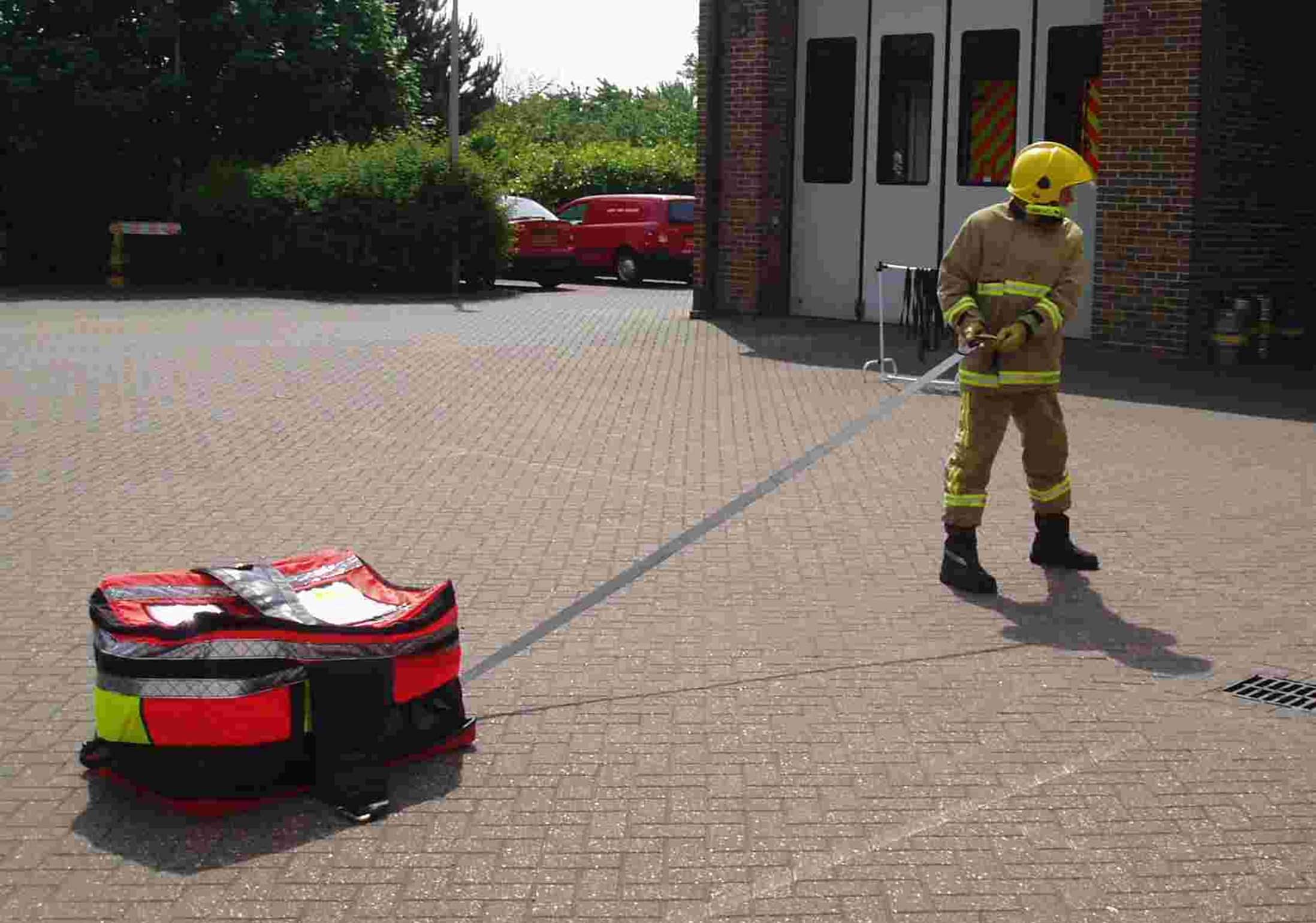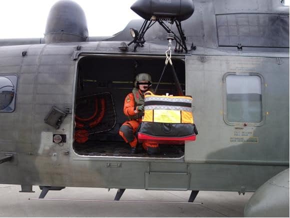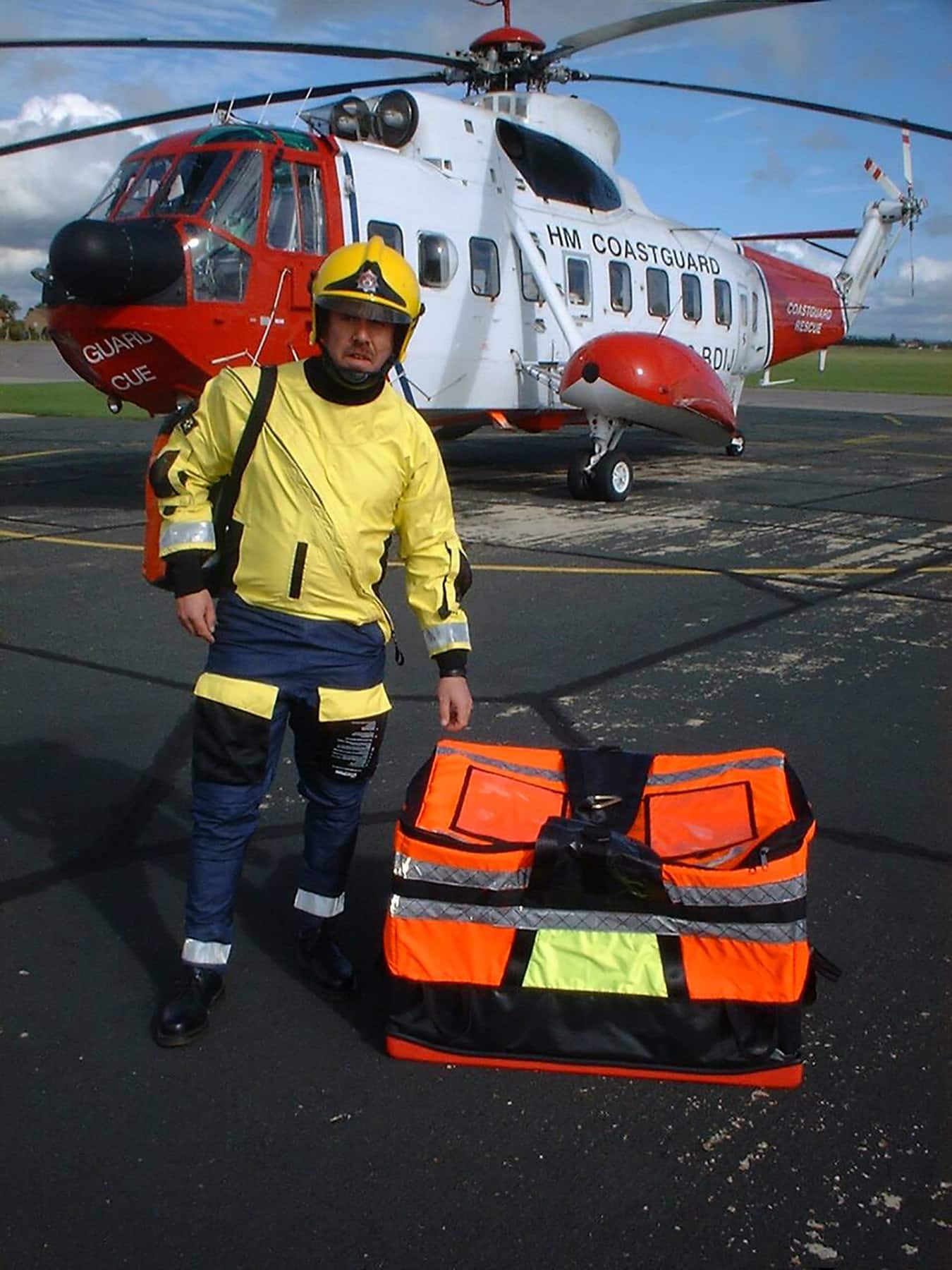Ruth Lee Helicopter Loading Bag med god plass for kystvakta, 330-skvadronen, brann og redning eller andre organisasjoner. Frakt brannslokkingsutstyr eller annet nødvendig via helikopter eller båt til hendelser i en kompakt og lett håndterlig bag. Alle sømmer er dobbelsydde, bagen har avrundete kanter og sterke løftestropper med DMM stålkarabiner for å løfte den. Mellom hver stropp er det satt inn forsterkning for å minimere spinn på bagen under transport. Toppen har to gjennomsiktige dokumentbeholdere i størrelse A4 for å legge inn dokumenter. En helikopter bag der den generelle fargen er High Visibility Orange, mens bånd og stropper er svarte.