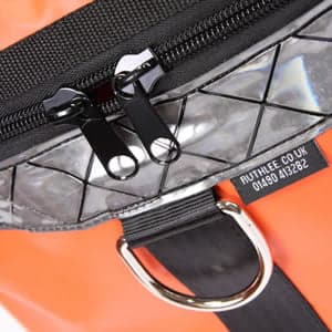 - Bærehåndtaket er konstruert av 38 mm høytetthetspolypropylenbånd, kan også hektes til bunnen av vesken i en krok for å danne en justerbar skulderstropp. Disse stroppene kan også løsnes for å feste bagen til en skipsskinne, ved hjelp av den store karabinkroken i rustfritt stål.