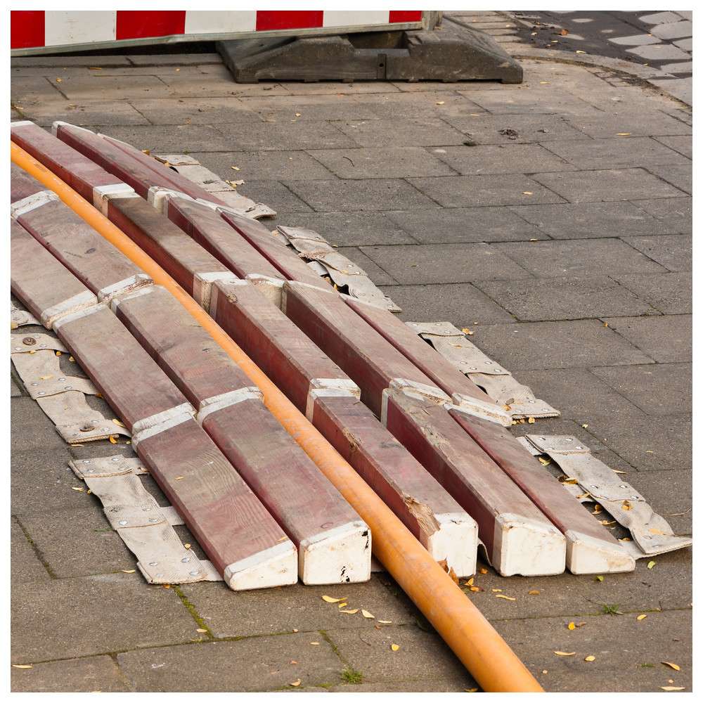 For to slanger, laget av gran, rødmalt, med hvite ender. Beltene, laget av UV-stabilisert polypropylen, er permanent sydd og festet med rustfrie nagler og galvaniserte stålplater.