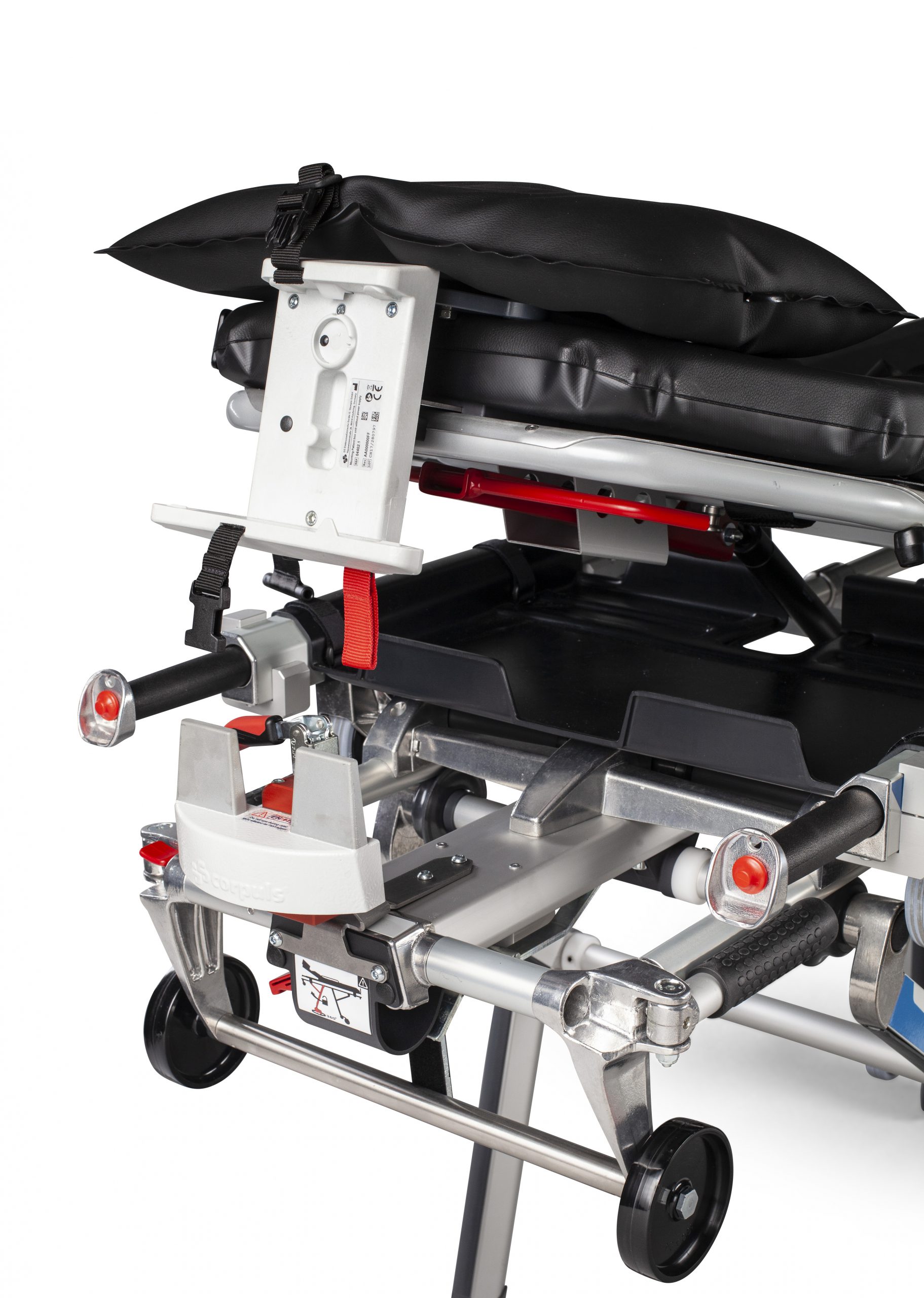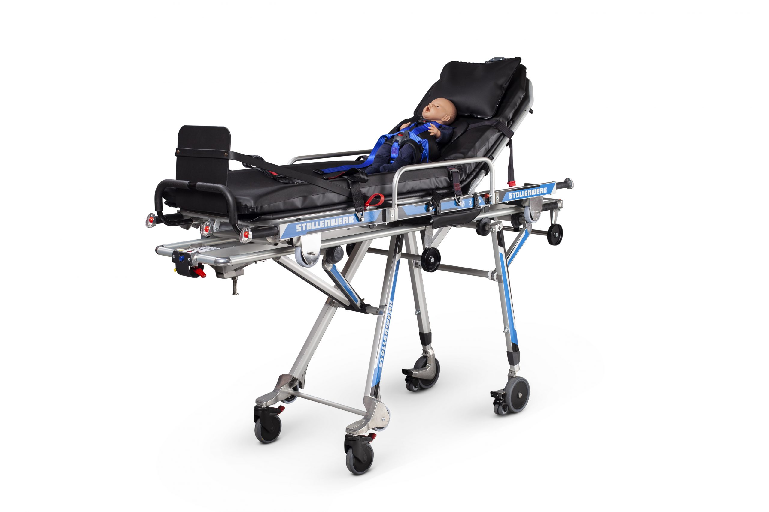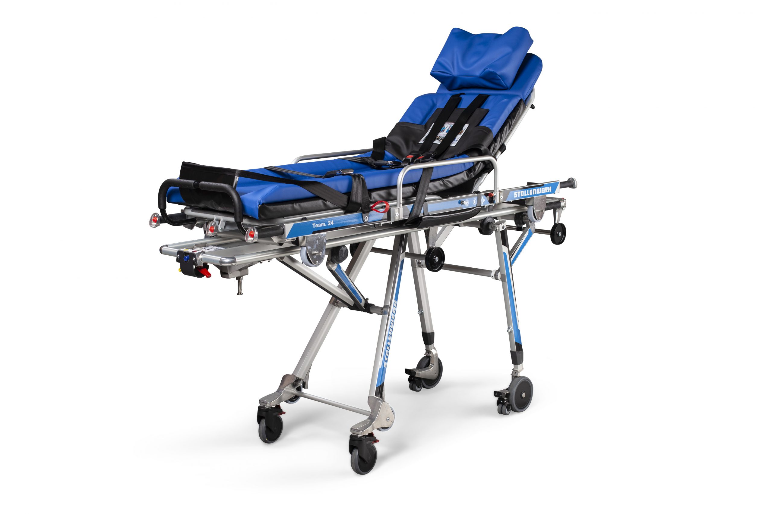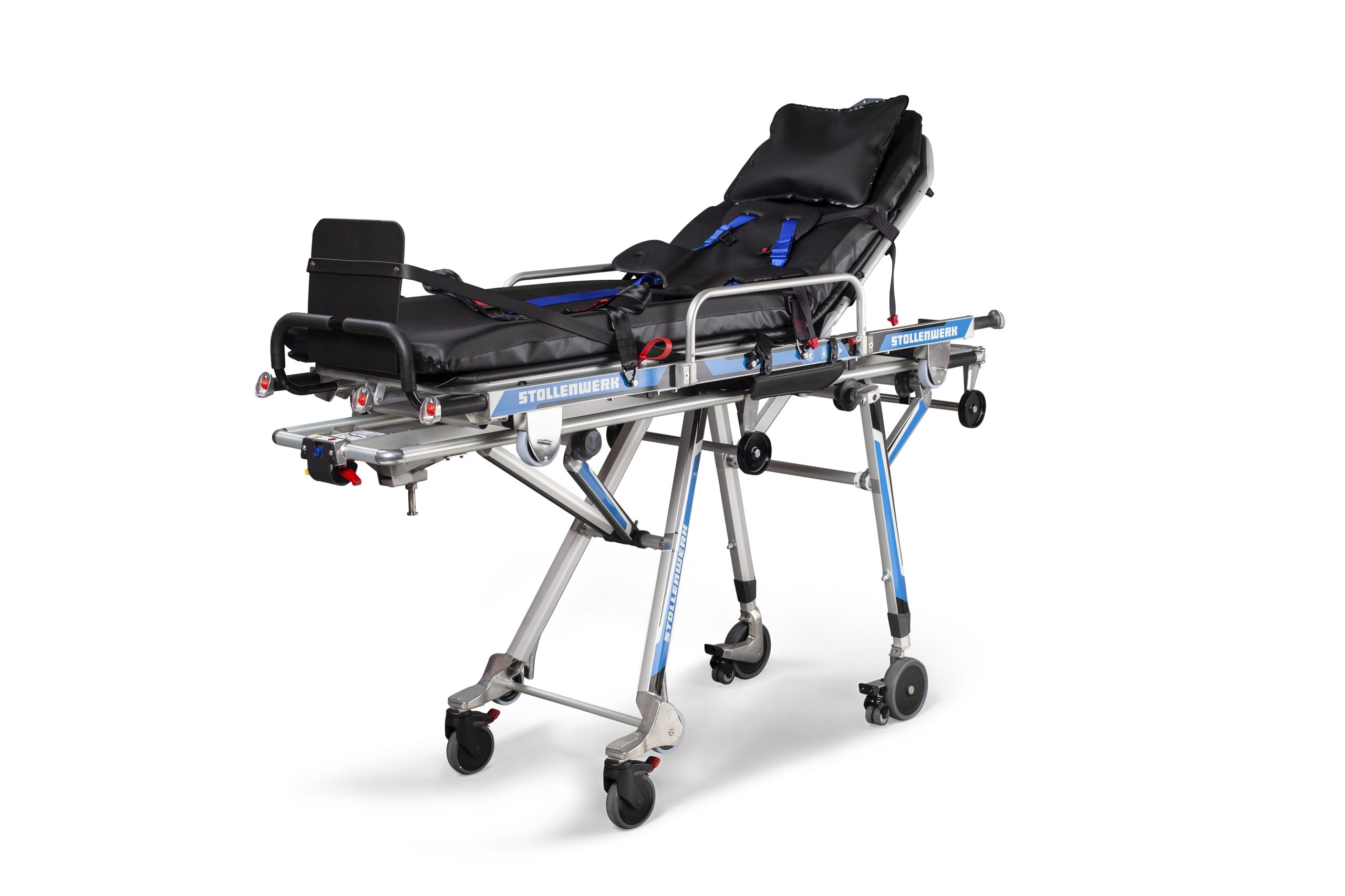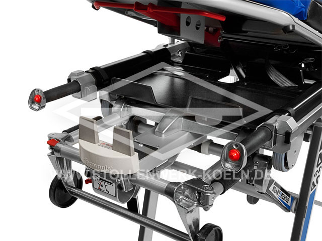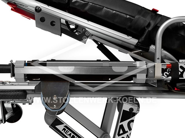 Patient positioning of the legs (the models 3003, 3006 und 3008 additionally offer a shock position option – The models 3006 and 3008 also offer the option for an abdominal wall relief and Fowler’s position, which makes them especially useful in a rescue vehicle. The model 3008 furthermore gives the possibility of a stepped bed position because the leg section can be continuously adjusted via a pneumatic spring.