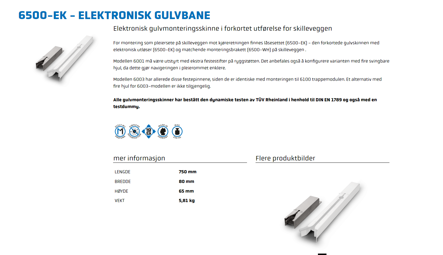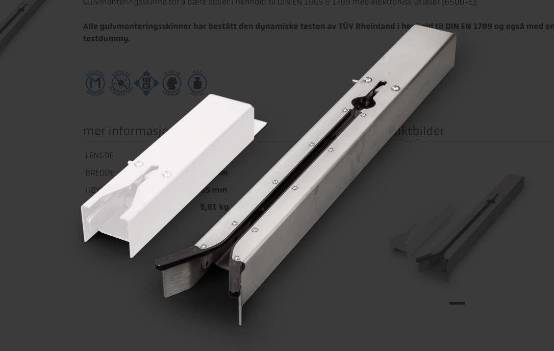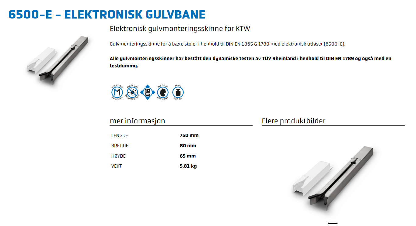 Alle gulvmonteringsskinner har bestått den dynamiske testen av TÜV Rheinland i henhold til DIN EN 1789 og også med en testdummy.
