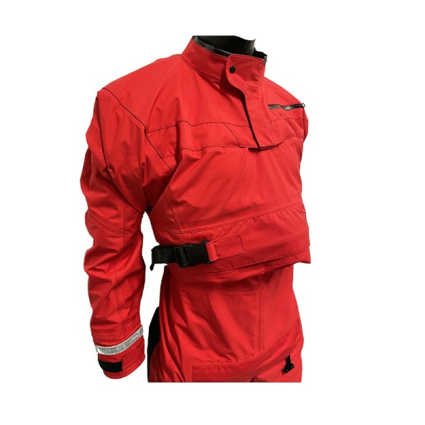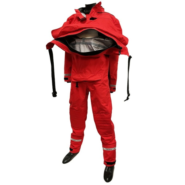 Den har 3-lags pustende stoff. Stor YKK-glidelås på brystet foran. Den har Twin Latex og er justerbar over mansjetter, og nakke forseglinger. Leddede og polstrede knær. Forsterket materiale i seteområdet. Innvendige justerbare seler. Integrert lateks tørrsokker. Drakten kommer i godt synlig rødfarge og med reflekterende SOLAS–refleks rundt håndleddene og ankler. Leddede armer og den har bekvemmelig glidelåslommer på arm og bryst. Drakten har også WC åpning i front.