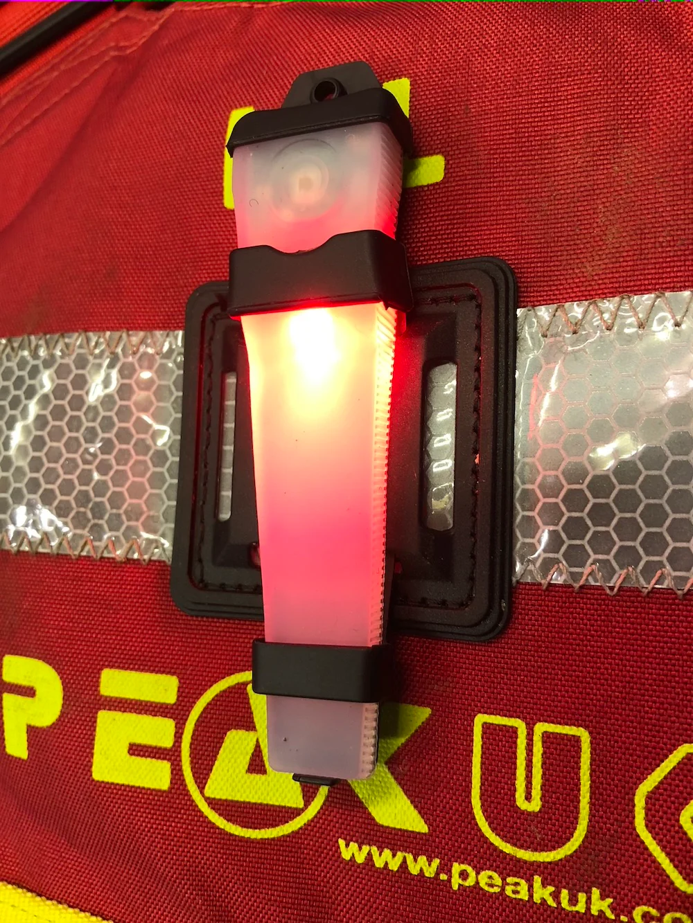 Silisiumforseglet Svært synlig LED som betjenes med en positiv klikk på/blink/av-knapp. Montert i hylster med borrelås for enkel feste til hjelm, PFD, båt.