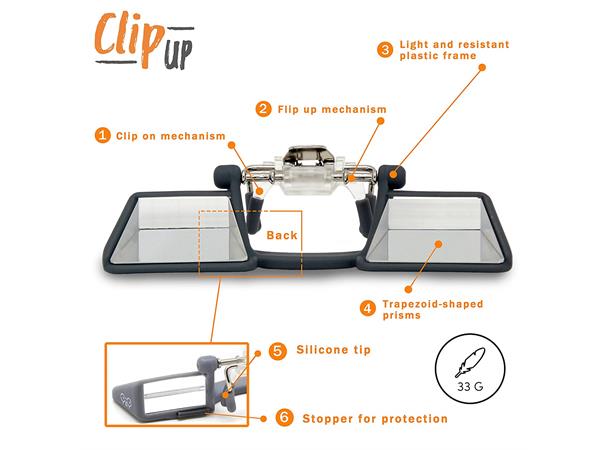 Clip Up er en evolusjon for alle brillebrukere. Bare klipp det på dine egne briller og sikre partneren din komfortabelt.