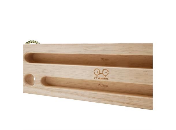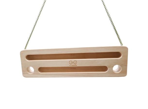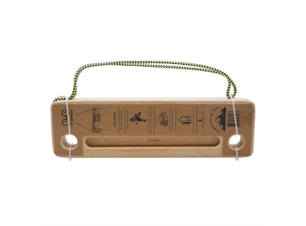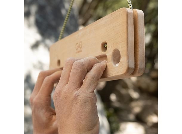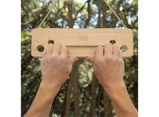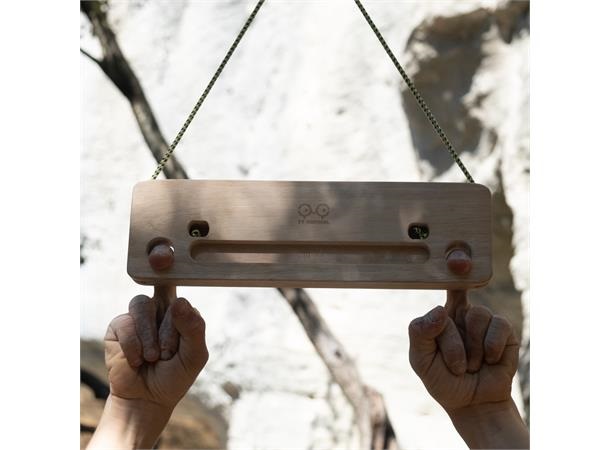 På tross av treverkets lette vekt, er dette et solid stykke treverk med furer som holder tauene i opphenget stabilt. Produktet har en elegant og praktisk 180 graders snufunksjon som gjør det enkelt å variere mellom flatene man henger på. Brettets tre avlange lister gjør det mulig å variere avstanden mellom hendene.